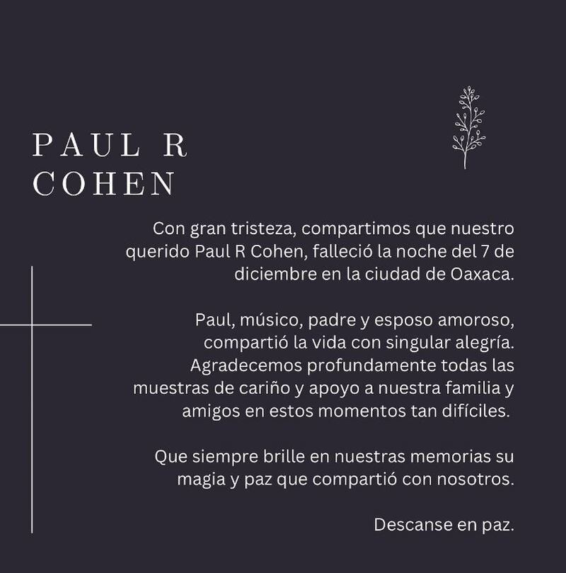 "Con gran tristeza, compartimos nuestro querido Paul R. Cohen falleció la noche del 7 de diciembre en la ciudad de Oaxaca. Paul, músico, padre y esposo amoroso compartió la vida con singular alegría. Agradecemos profundamente todas las muestras de cariño y apoyo a nuestra familia y amigos en estos momentos tan difíciles", escribió en un comunicado oficial