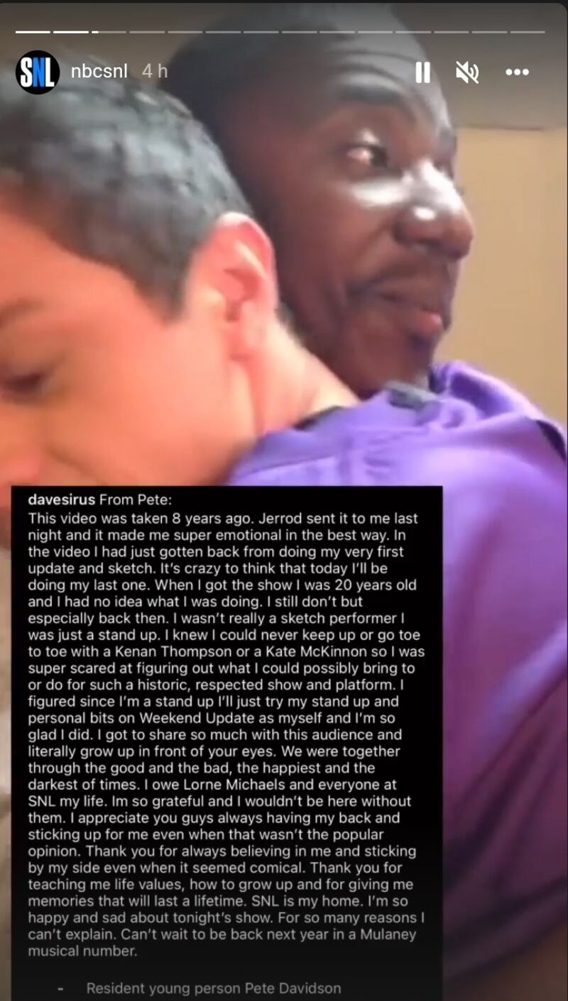 "Estoy muy agradecido y no estaría aquí sin ellos. Les agradezco que siempre me respalden y me defiendan, incluso cuando esa no era la opinión popular. Gracias por creer siempre en mí y estar a mi lado incluso cuando parecía cómico. Gracias por enseñarme valores de vida, cómo crecer y por darme recuerdos que durarán toda la vida. SNL es mi hogar. Estoy tan feliz y triste por el programa de esta noche. Por tantas razones que no puedo explicar. No puedo esperar a volver el próximo año en un número musical de Mulaney. — Joven residente Pete Davidson", finalizó.