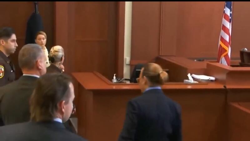 En un video que circula en redes sociales se muestra el momento justo en que Heard se levantó del estrado y tras caminar unos pasos se asustó, al ver que su ex esposo caminó hacia donde ella estaba.