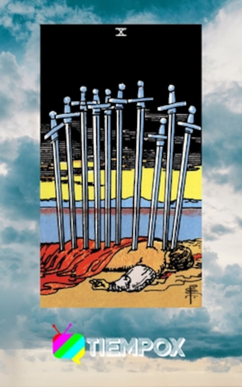 Hoy el consejo viene de un Arcano Menor, el 10 de Espadas. En ella observamos una persona tumbada en el suelo, sobre quien caen 10 espadas que le son enterradas en la espalda.