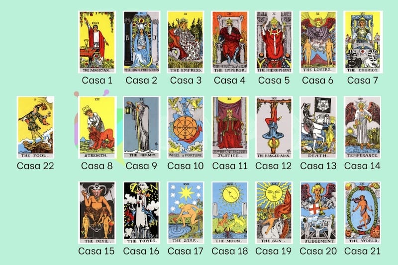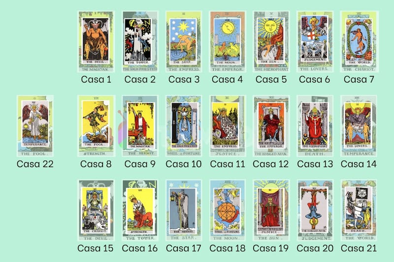 Cada una de esas cartas se convierte en las "casas" que nos hablarán de determinados temas que serán habitadas luego por otro Arcano Mayor. Por ejemplo, la casa 4 de El Emperador hablará cómo la persona se relaciona con la paternidad, las parejas masculinas y cómo acciona en el mundo su vida, mientras que la casa 15 de El Diablo, habla de los miedos, culpas, pasiones y obsesiones.