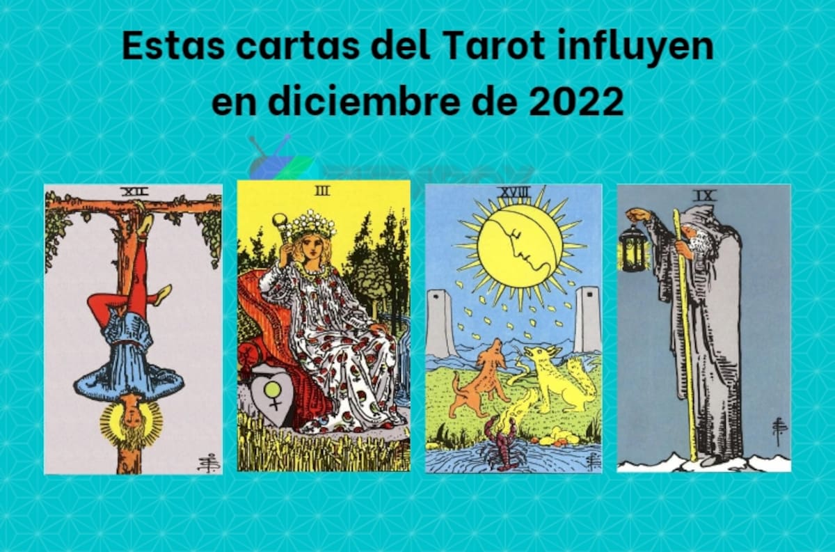 Como antes dijimos, diciembre es el mes 12 y el 2022 es reducido (2+0+2+2) que dando en 6. Así, la sumatoria da 18, que es la carta de La Luna, que llega acompañada de El Ermitaño. Así, ambas cartas llegan a habitar en diciembre a la casa de El Colgado y La Emperatriz.