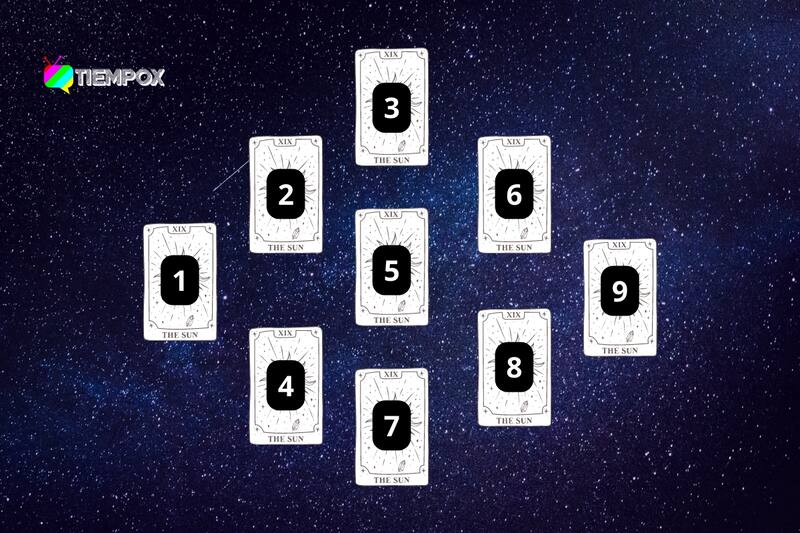 - Finalmente, con la idea ya en tu cerebro y la intención sobre las cartas revuelve el mazo, saca 9 cartas y ordénalas de manera en que indica la imagen.