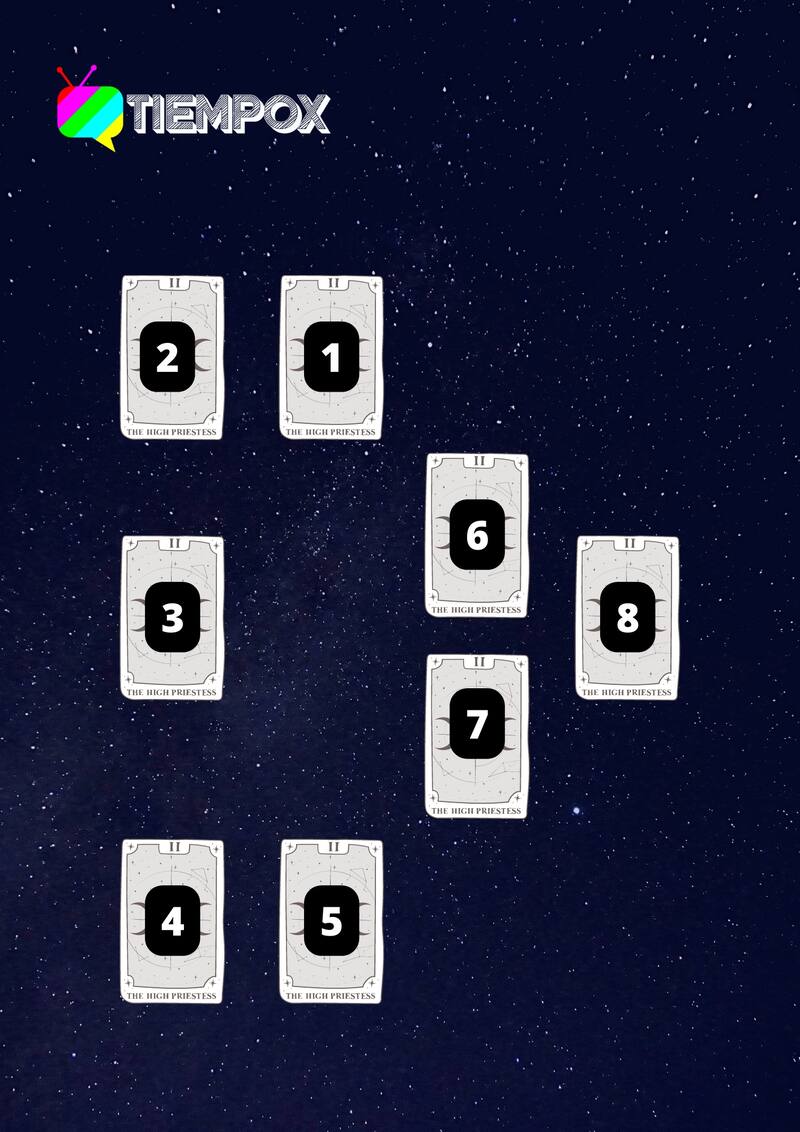 - Finalmente, con la idea ya en tu cerebro y la intención sobre las cartas revuelve el mazo, saca 8 cartas y ordénalas de manera en que indica la imagen.