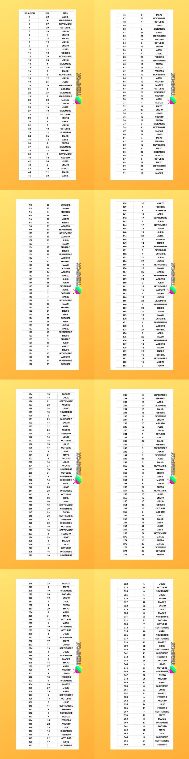 Esta es la tabla de la fortuna japonesa con la posición de todas las fechas
