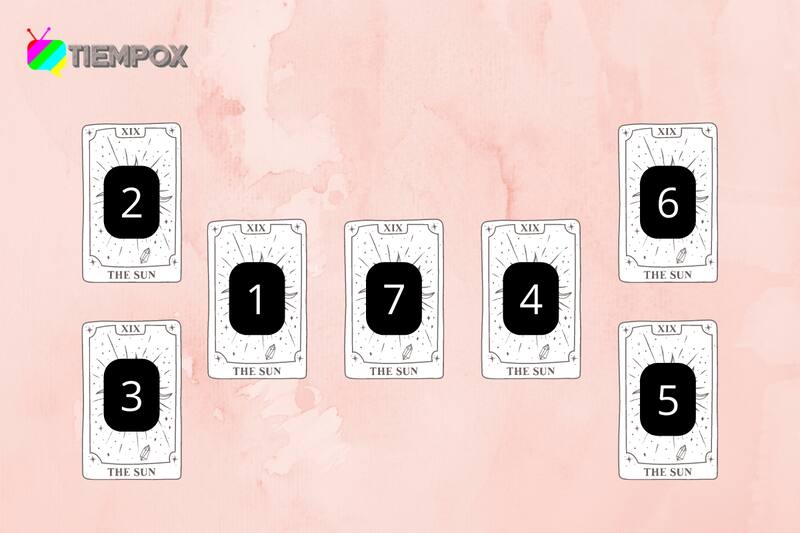- Finalmente, con la idea ya en tu cerebro y la intención sobre las cartas revuelve el mazo, saca 7 cartas y ordénalas de manera en que indica la imagen.