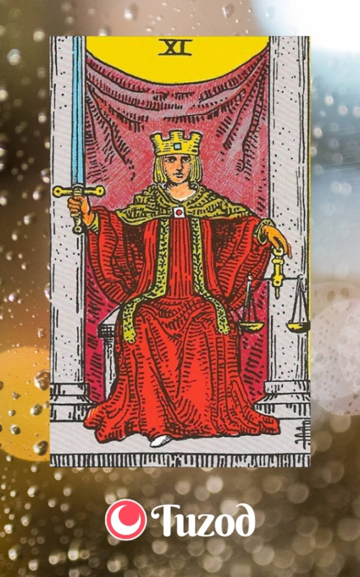 El día de hoy nos aconseja un Arcano Mayor, La Justicia. En esta carta observamos al personaje principal sentado en un trono y sosteniendo una espada en la mano derecha y una balanza en la izquierda, vistiendo una túnica roja con detalles dorados, mismo color que tiene su corona.