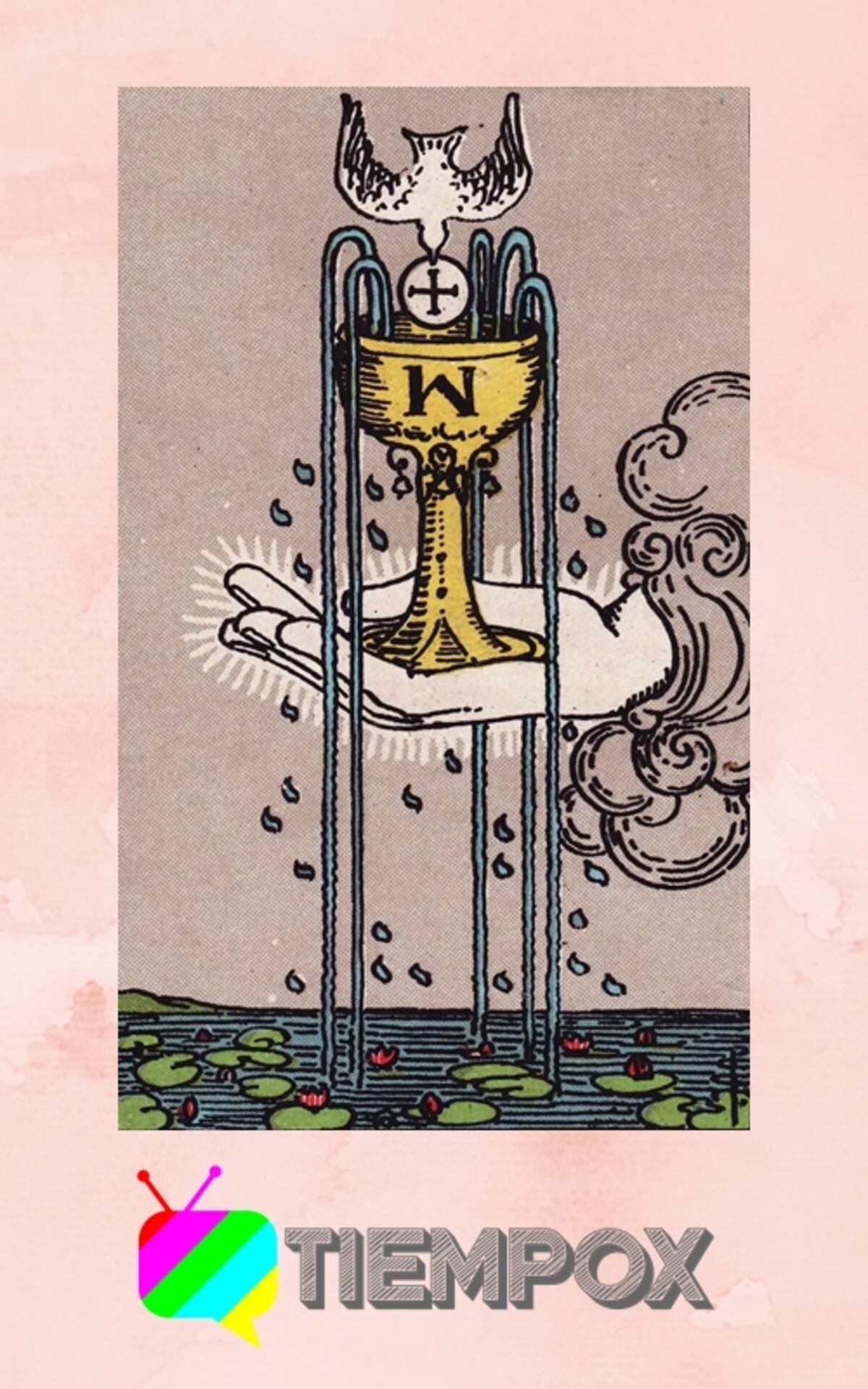 El día de hoy nos aconseja un Arcano Menor, el As de Copas. En esta carta observamos una copa que es sostenida por una mano que emerge de entre una nube, en la cual está ingresando una paloma con un círculo, cáliz desde el cual parecen emerger cinco chorros de agua que caen en un lago.