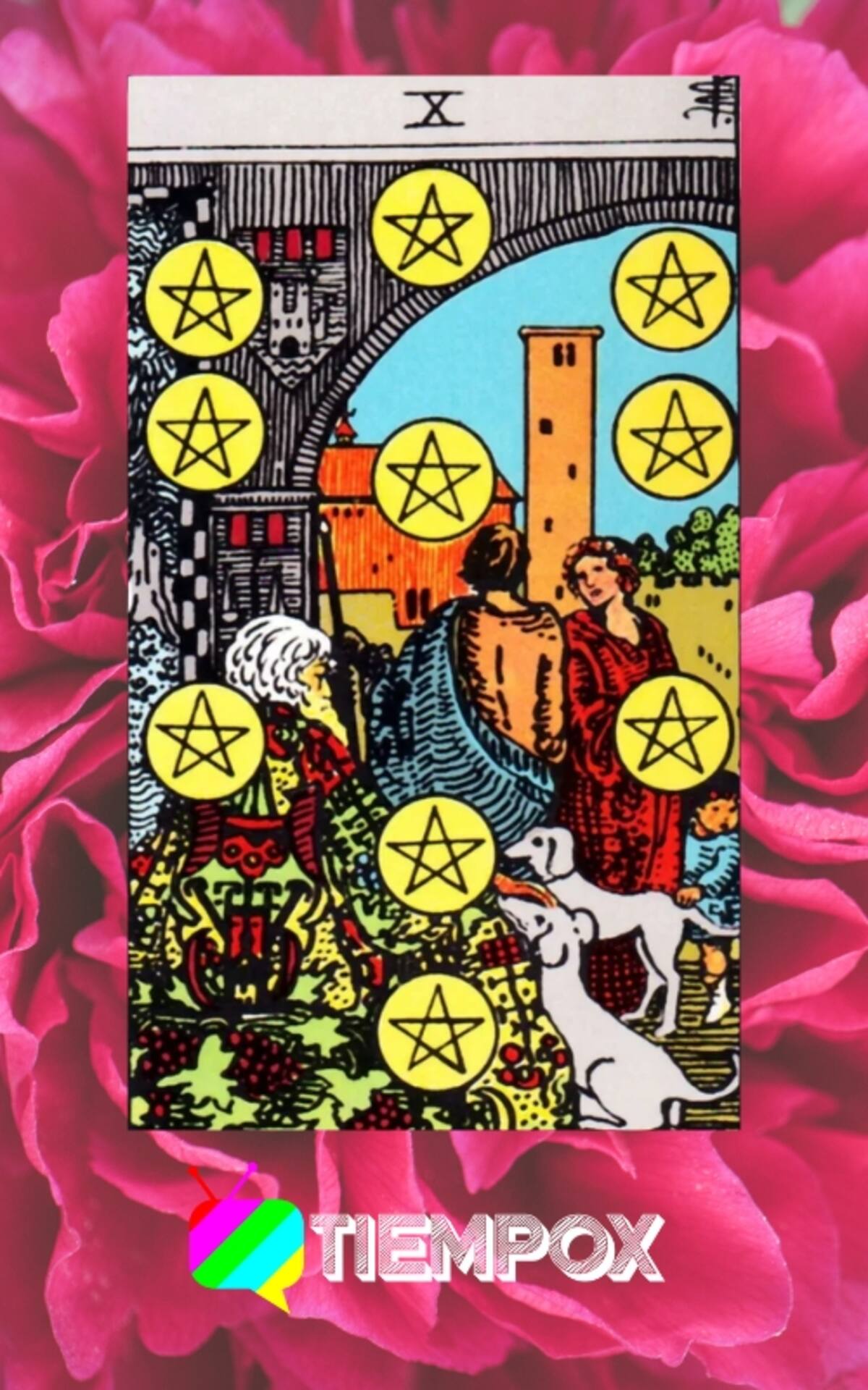 El día de hoy nos aconseja un Arcano Menor, el 10 de Oros. En esta carta observamos un hombre mayor vestido con una colorida capa a quien se le acercan unos perros, detrás de los cuales se observa una ciudad y dos adultos conversando, con un niño en la mano.