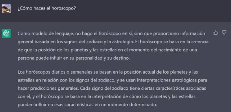 Es más, como el mismo Chat GPT lo admite, "como modelo de lenguaje, no hace el horóscopo en sí, sino que proporciona información general basada en los signos del Zodiaco y la Astrología", ya que esta IA no tiene en consideración la posición de los astros en tiempo real, es más, la información que maneja, según la misma IA, es de hace dos años.