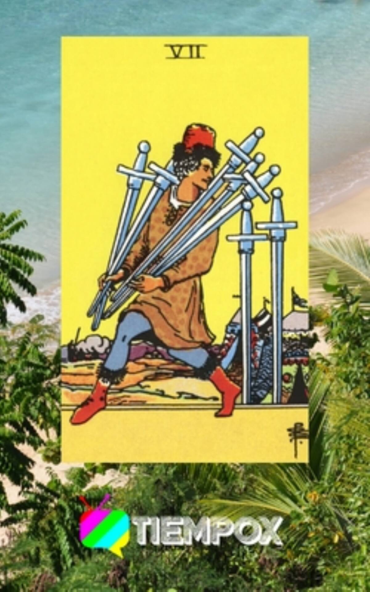 El consejo para hoy lo entrega un Arcano Menor, el Siete de Espadas. En la carta encontramos un personaje que carga con cinco espadas mientras está semi arrodillado, con dos espadas más al costado derecho y carpas extendidas detrás a lo lejos.