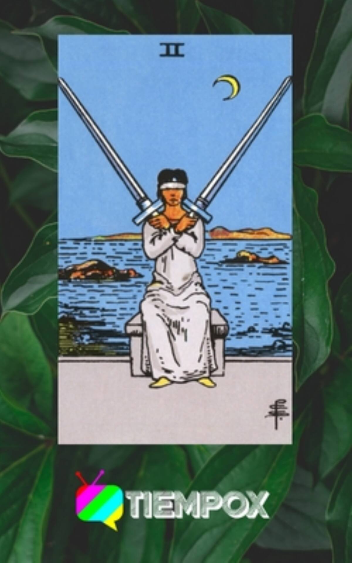 El día de hoy nos aconseja un Arcano Menor, el 2 de Espadas. En esta carta observamos un personaje que está sentado a la orilla de un lago, con los brazos cruzados y una espada en cada mano.