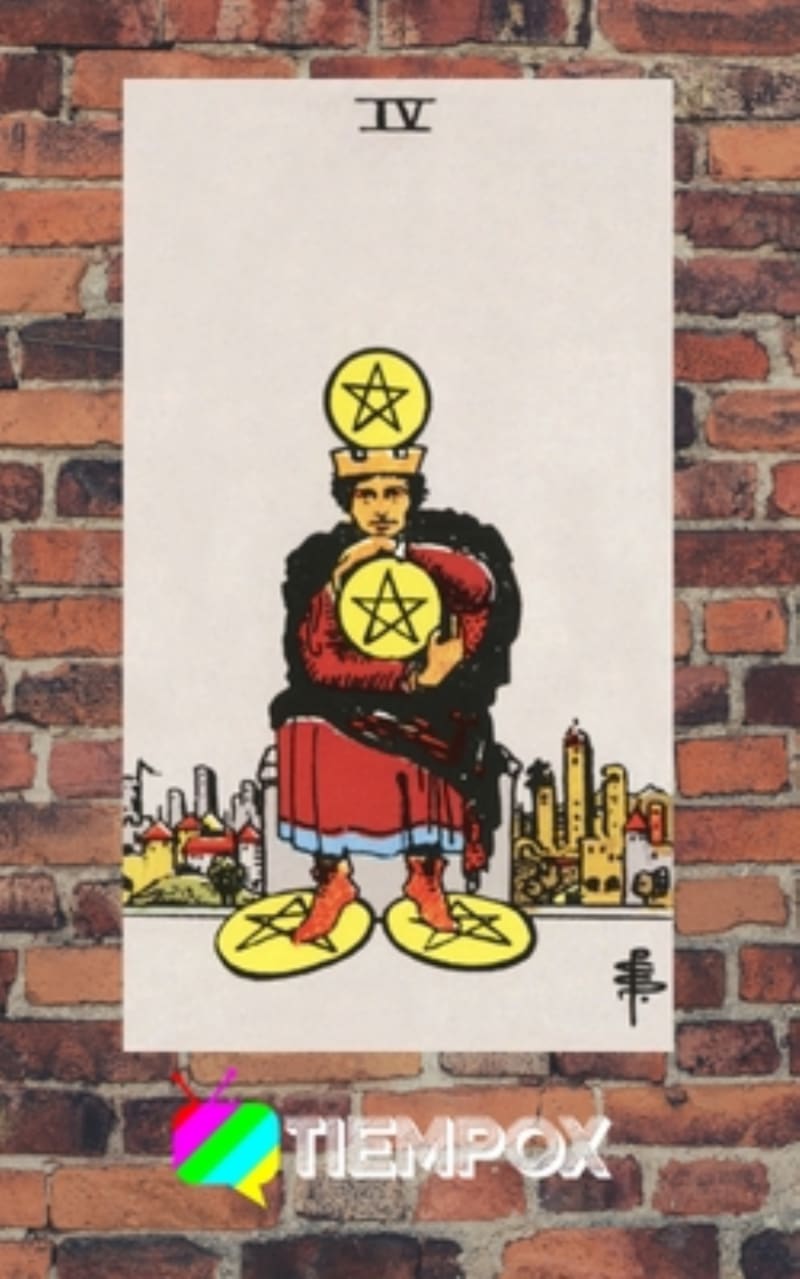 La carta que nos aconseja hoy es un Arcano Menor, el Cuatro de oros. En ella observamos un rey vestido de rojo, en cuyos pies tiene una moneda, al igual que otra entre sus manos y una cuarta sobre la cabeza, mientras que en el fondo se observa una ciudad de altos edificios.