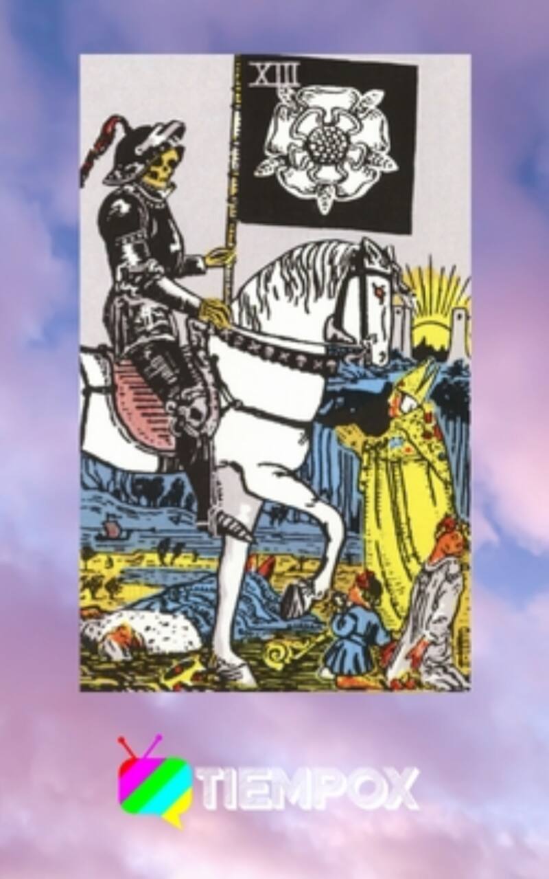 La carta que nos aconseja hoy es un Arcano Mayor 13, cuyo nombre es La Muerte. En ella podemos ver un caballero que porta una armadura montado en un caballo, con un rostro calavérico. Bajo él, un persona yace tendida en el suelo y al frente, un infante, un adolescente y la figura de un obispo, quien mira la bandera que el personaje principal carga.