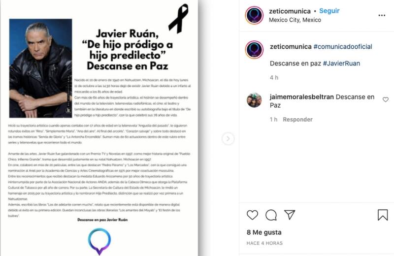 Falleció de un infarto al miocardio Javier Ruán, actor conocido por su trabajo en telenovelas como "Rina", el remake de "Simplemente María", "Ana del aire", Al final del arcoíris", "Corazón salvaje", "María la del Barrio" y las históricas "Senda de gloria" y "La antorcha encendida".