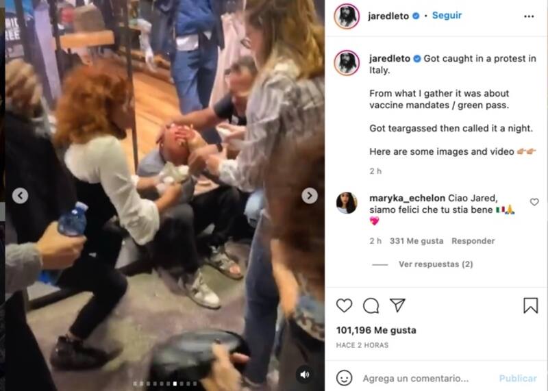 El actor Jared Leto compartió en sus historias de Instagram su experiencia al quedarse en medio de una protesta por la vacunación del Covid-19 en Roma, Italia.