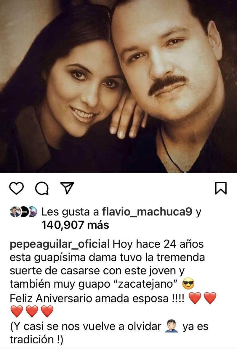 No importa el transcurrir del tiempo, Pepe Aguilar sigue muy enamorado y disfrutando de la vida al lado de su esposa Aneliz Álvarez, a quien le dedicó un emotivo mensaje en redes sociales, con motivo de su 24 aniversario de bodas.