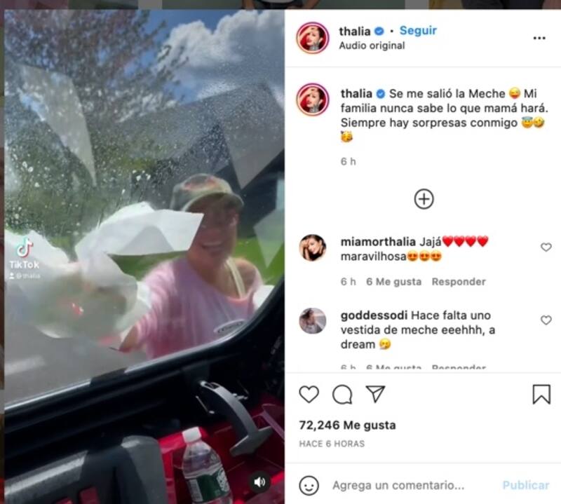 "Me salió la Meche. Mi familia nunca sabe lo que mamá hará. Siempre hay sorpresas conmigo", escribió Thalía en el video que ya tiene más de 70 mil reproducciones en Instagram.