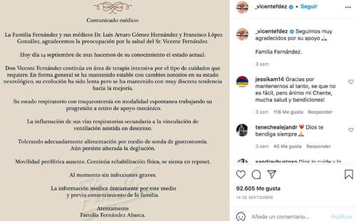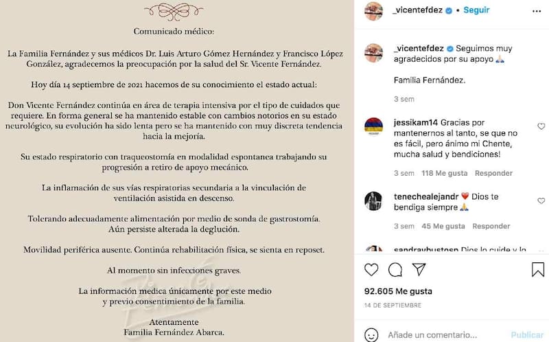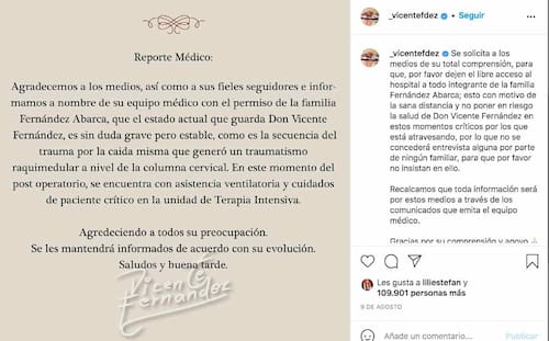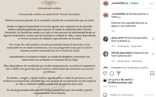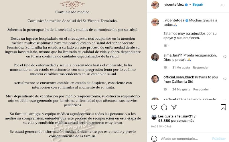 Además, reportaron que don Vicente Fernández seguía en terapia intensiva, despierto, con una traqueostomía y que se le alimentaba por medio de una sonda. Anunciaron que la recuperación de su movilidad sería muy lenta.
