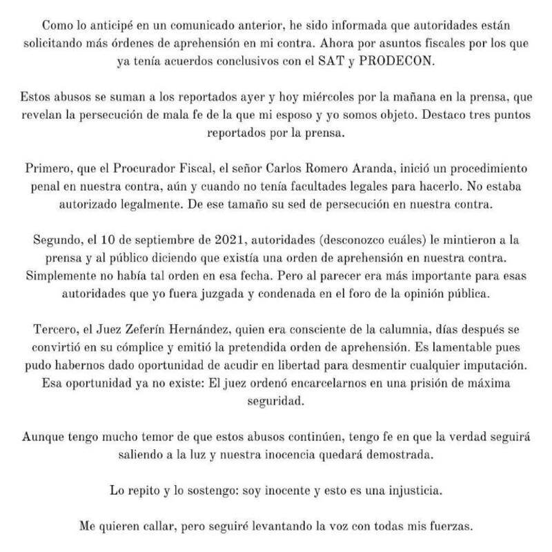 En el segundo, señaló: "El 10 de septiembre de 2021, autoridades (desconozco cuáles) le mintieron a la prensa y al público diciendo que existía una orden de aprehensión en nuestra contra. Simplemente no había tal orden en esa fecha. Pero al parecer era más importante para esas autoridades que yo fuera juzgada y condenada en el foro de la opinión pública.