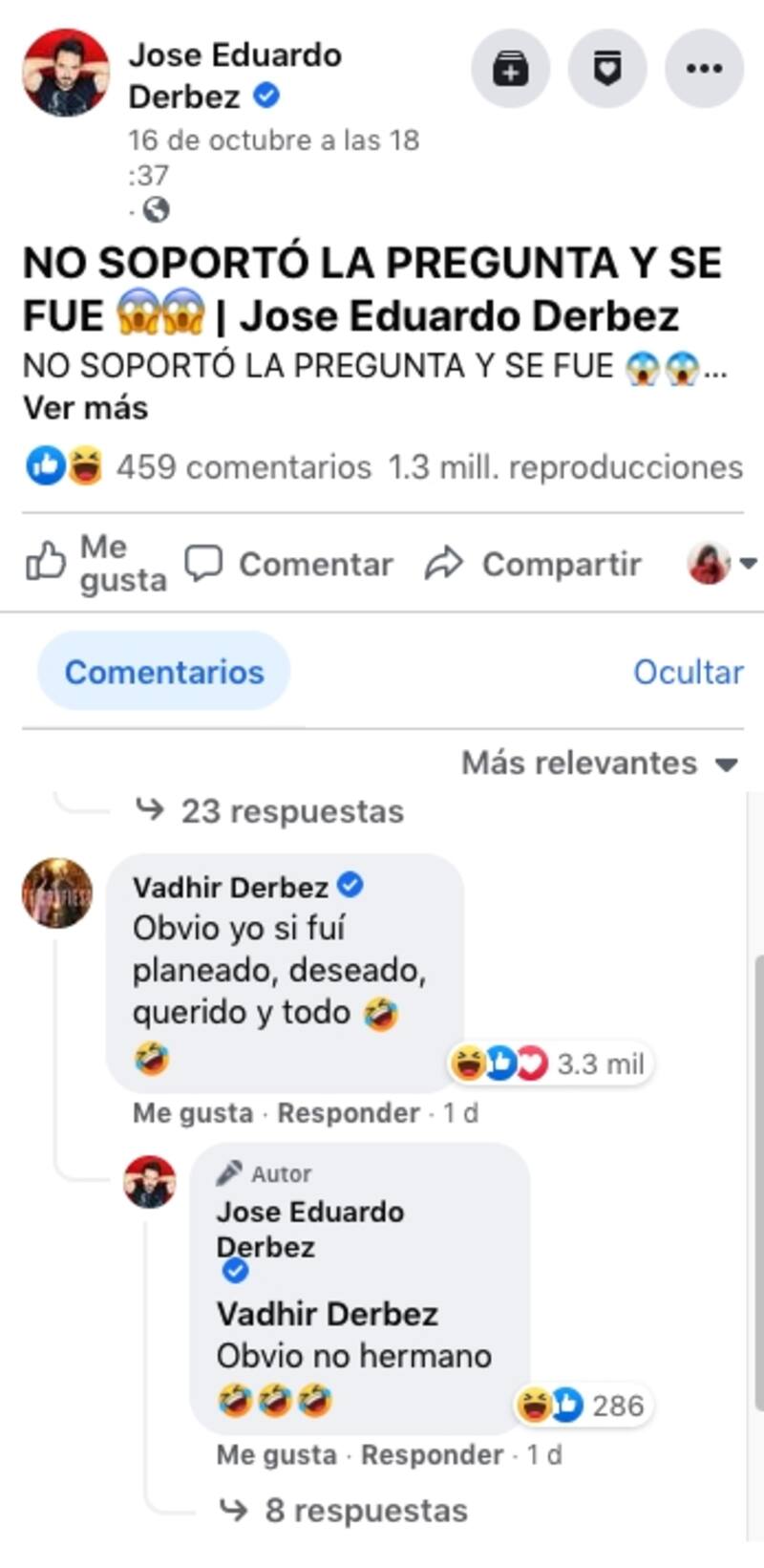 No todo se quedó en la conversación entre Eugenio Derbez y José Eduardo, sino que al video se sumó la opinión de Vadhir, quien escribió en los comentarios: "Obvio yo si fuí planeado, deseado, querido y todo". Mientras que el hijo de Victoria Ruffo, le contestó a su hermano: "Obvio no, hermano", entre risas.