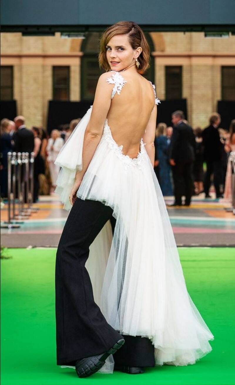 Para ello, la estrella de la saga de Harry Potter utilizó un atuendo construido con 10 vestidos de novia. La pieza contaba con un blusón de tul blanco asimétrico, con escote de encaje y espalda descubierta, así como unos pantalones negros wide de la diseñadora Stella McCartney.