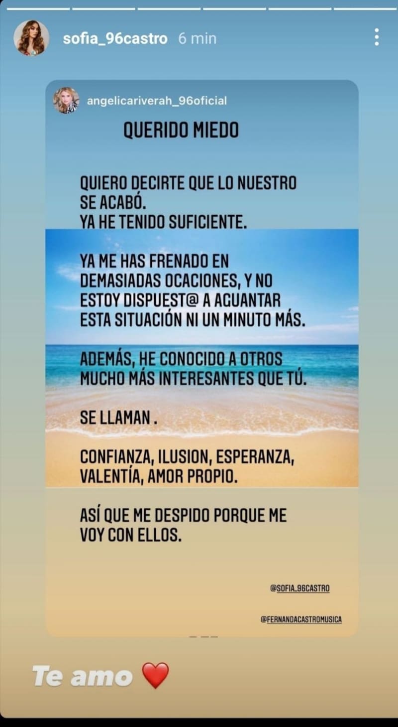 El tema salió a la mesa debido a que recientemente, la actriz de "Destilando Amor", regresó a las redes sociales después de su separación del expresidente de México. Y compartió con sus seguidores una historia en la que se despide del miedo.