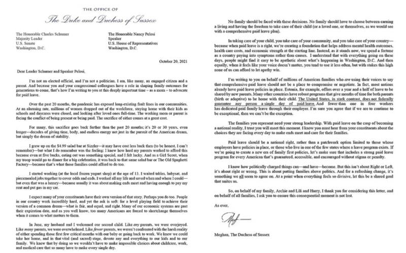 Recientemente plataforma sin ánimo de lucro Paid leave for all (Permiso retribuido para todos) publicó una carta de la oficina de los duques de Sussex firmada por Meghan a fecha del 20 de octubre y dirigida a dos políticos de alto nivel, la presidenta de la Cámara de Representantes, Nancy Pelosi (demócrata por California) y al líder de la mayoría del Senado, el también demócrata Charles E. Schumer.