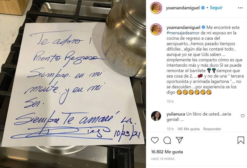 "Me encontré este mensaje de amor de mi esposo en la cocina de regreso a casa del aeropuerto…", escribió al pie de su publicación.