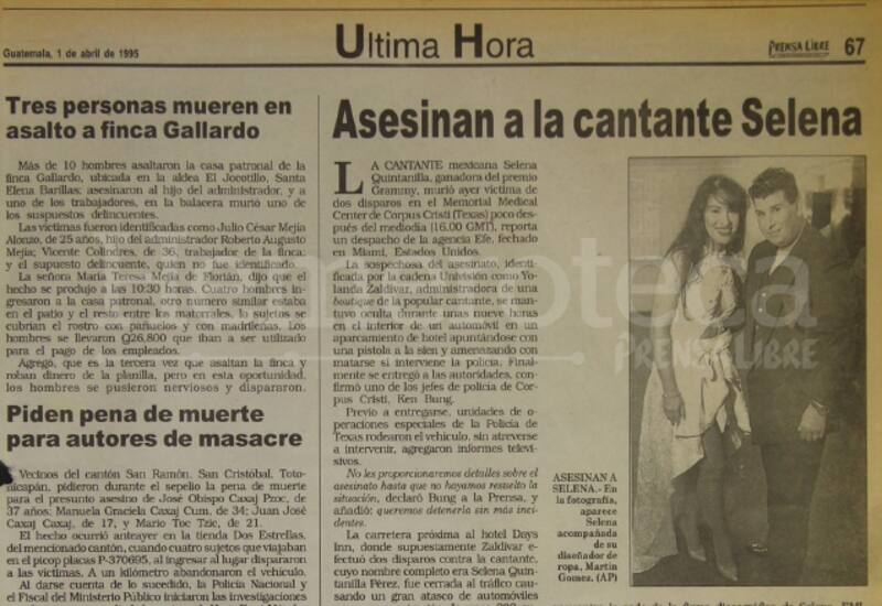 "Asesinan a la cantante Selena", daba a conocer Prensa Libre de Guatemala: