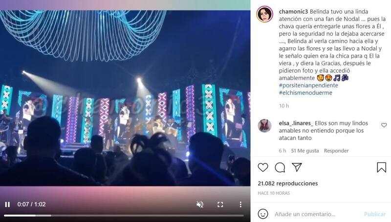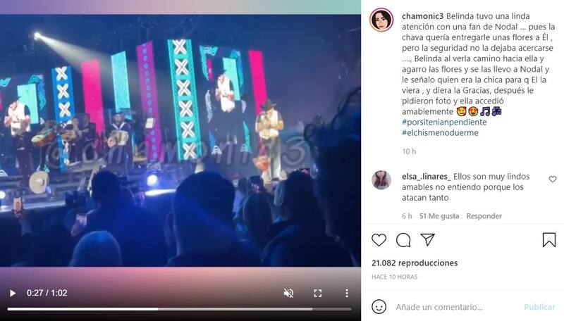En las imágenes difundidas en dicha red social, se puede ver a Belinda llevando hasta las manos de su novio el regalo de la fanática, provocando que Nodal interrumpiera su show y agradeciera en vivo a la joven.