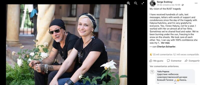 A través de la red social, Svetnoy dirigió un mensaje en contra del asistente de dirección Dave Halls y la armera Hannah Gutierrez-Reed, a los que señaló como responsables de la muerte de su amiga.