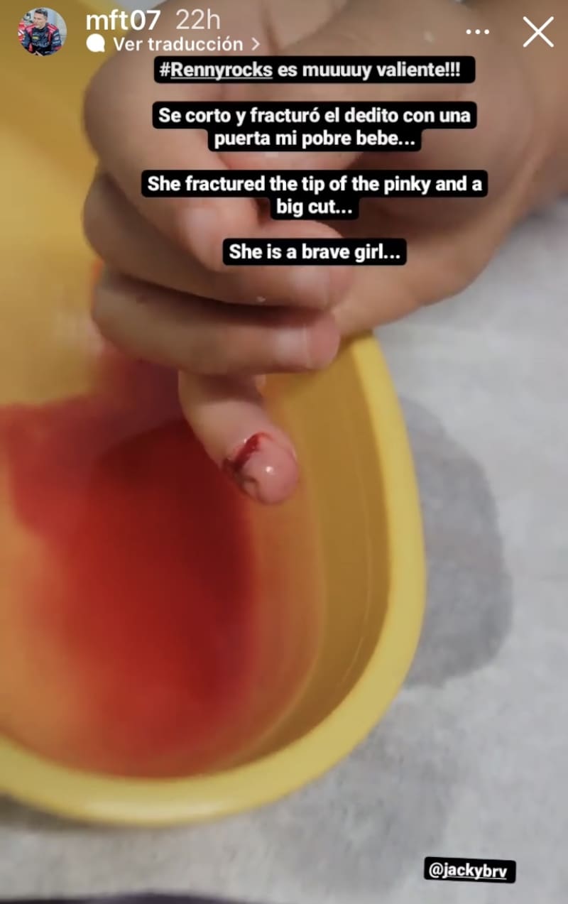 "Se cortó y fracturó el dedito con una puerta, mi pobre bebé. Renny es muy valiente… Saca el dedito, enséñamelo aquí a la cámara", se escucha decir al piloto de carreras, y minutos después, muestra cómo Renata se portó muy valiente al no llorar pese a lo delicada de la situación.