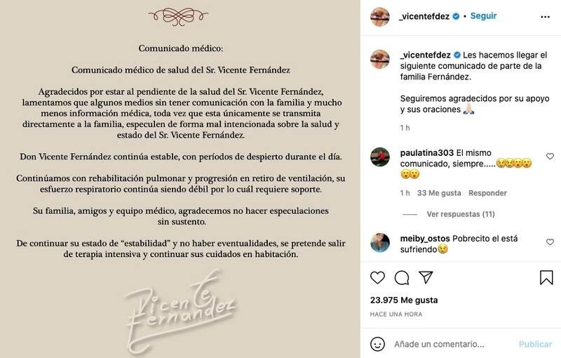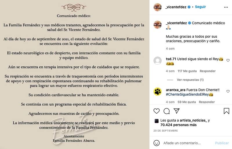 Además, reportaron que don Vicente Fernández seguía en terapia intensiva, despierto, con una traqueostomía y que se le alimentaba por medio de una sonda. Anunciaron que la recuperación de su movilidad sería muy lenta.
