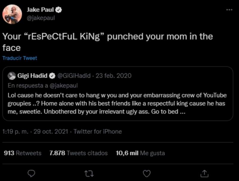 Pero tras el conflicto entre Gigi Hadid y Zayn Malik, Jake Paul aprovechó de retuitear ese antiguo tweet de la modelo para burlarse de ella, y recordarle el escándalo.