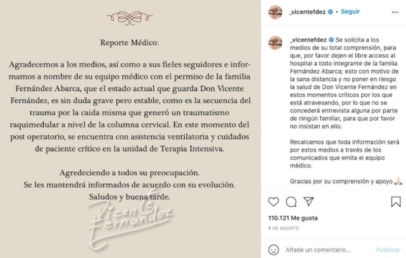 Además, reportaron que don Vicente Fernández seguía en terapia intensiva, despierto, con una traqueostomía y que se le alimentaba por medio de una sonda. Anunciaron que la recuperación de su movilidad sería muy lenta.
