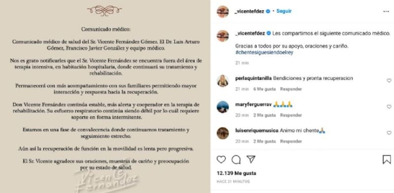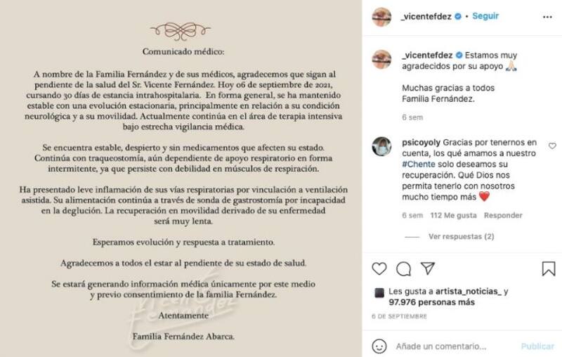 En el comunicado médico oficial compartido en la cuenta oficial de Instagram del ídolo de regional mexicano, se da a conocer la información oficial, se dice que "Don Vicente Fernández continúa estable, más alerta y cooperador en la terapia de rehabilitación. Su esfuerzo respiratorio continúa siendo débil por lo cual requiere soporte en forma intermitente".