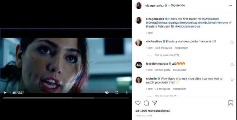 En "Ambulancia", Eiza, a quien el propio Bay elogió en Instagram diciéndole que “tiene una actuación sorprendente” en la película que estrenará en febrero de 2022, interpreta a "Cam Thompson", una paramédica que va a bordo de una ambulancia secuestrada por un par de delincuentes que acaba de robar un banco y cuyo escape se ha complicado.