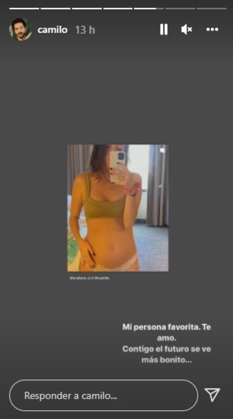 Camilo también compartió el mismo carrusel de fotos y videos en su perfil, el cantante publicó en sus historias la publicación de Evaluna donde aparece con su pancita de embarazada, con un mensaje lleno de amor hacia su esposa. "Mi persona favorita. Te amo. Contigo el futuro se ve más bonito", se puede leer la foto.