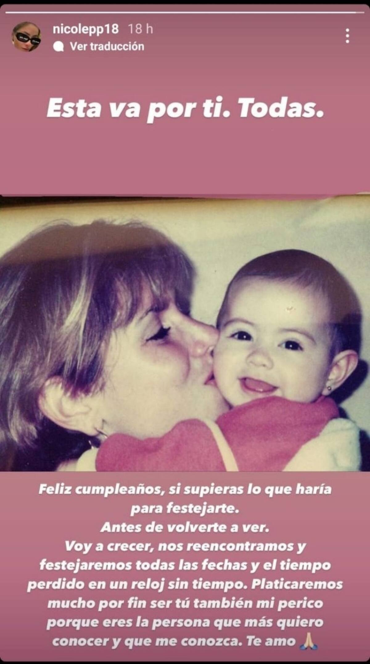 La joven recordó a su mamá con una emotiva publicación en el que hubiera sido su cumpleaños 59, a través de sus Instagram Stories: Una fotografía de Monica Pretelini dando un beso a una pequeña Nicole Pena.