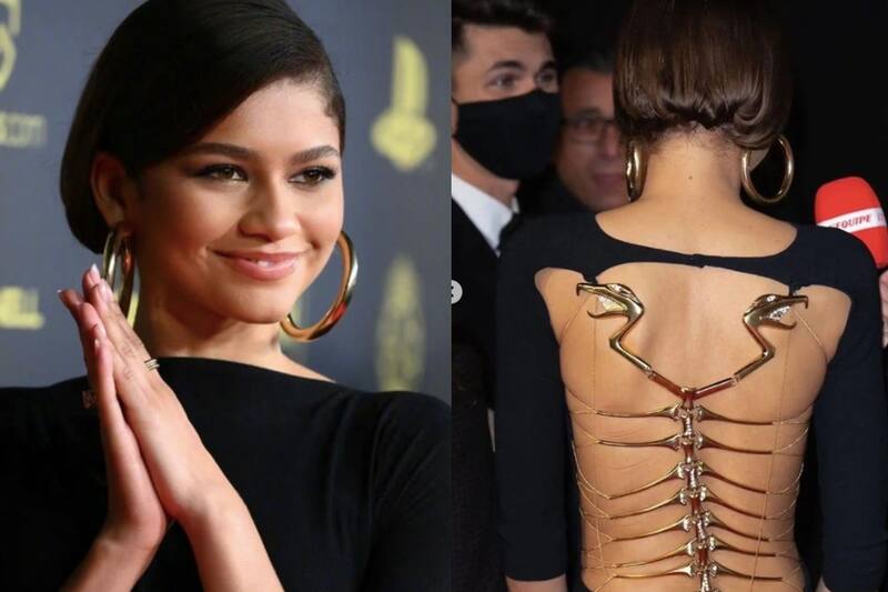 Zendaya apareció enfundada en un vestido largo entallado de manga larga con manga francesa de aspecto minimalista por delante, pero cuando vimos la espalda (¡wow!), la acrtriz mostraba un impactante escote trasero decorado con joyería dorada que simulaba la columna vertebral, pero con dos cabezas de serpiente al final cerca del cuello con incrustaciones de pedrería que parecía tener forma de un escorpión. La creación es obra de Fausto Puglisi para Roberto Cavalli, el cual estilizó con arracadas de oro XL y un recogido sobrio que da la apariencia de un corte tipo 'bob' con raya de lado.