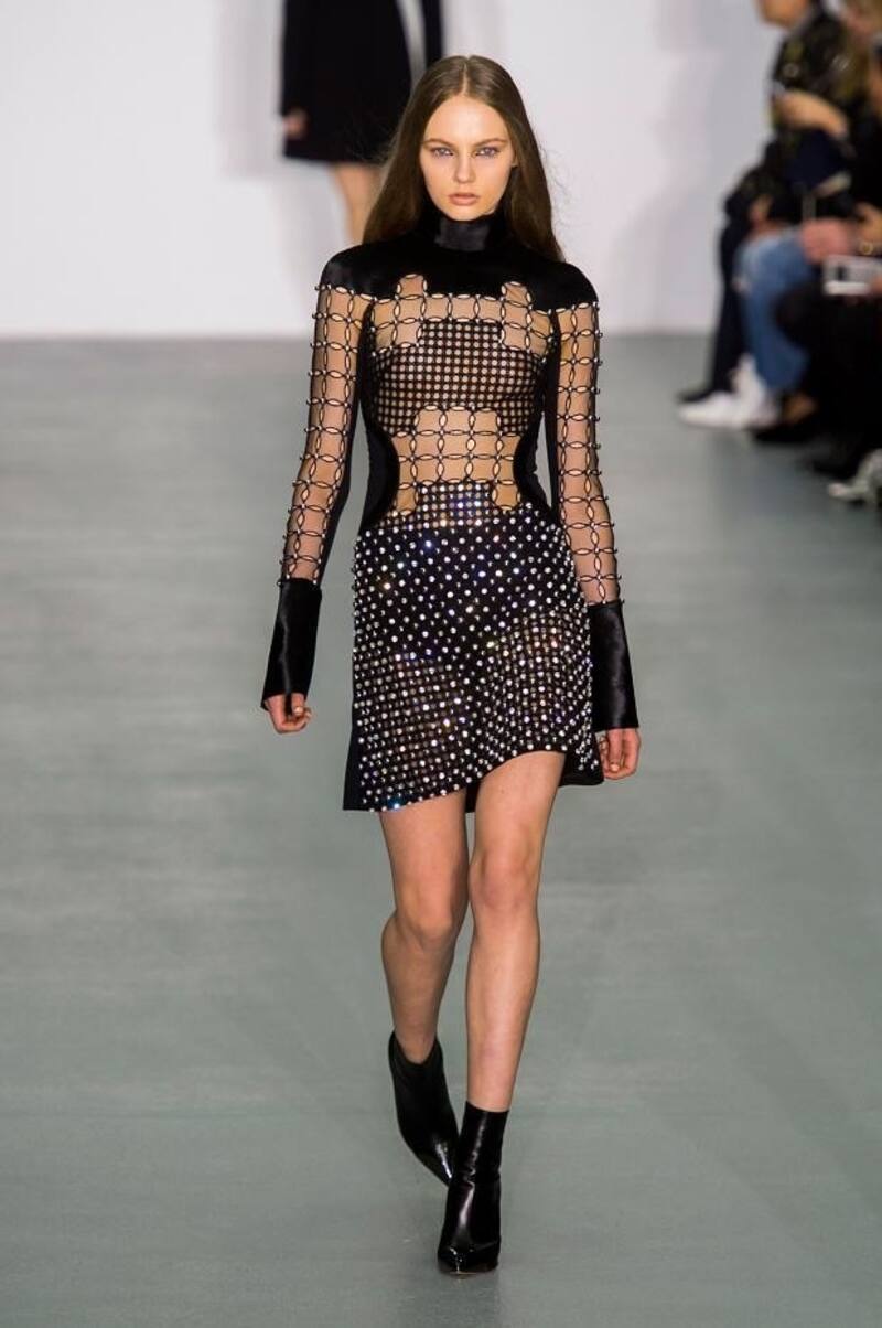 La prenda en cuestión se trata de un vestido firmado por el diseñador David Koma de su colección Otoño/Invierno 2016, confeccionado en terciopelo rasado de color negro con cuello alto y mangas evasés sobre el que habían cosido una especie de enrejado con transparencia persistente.