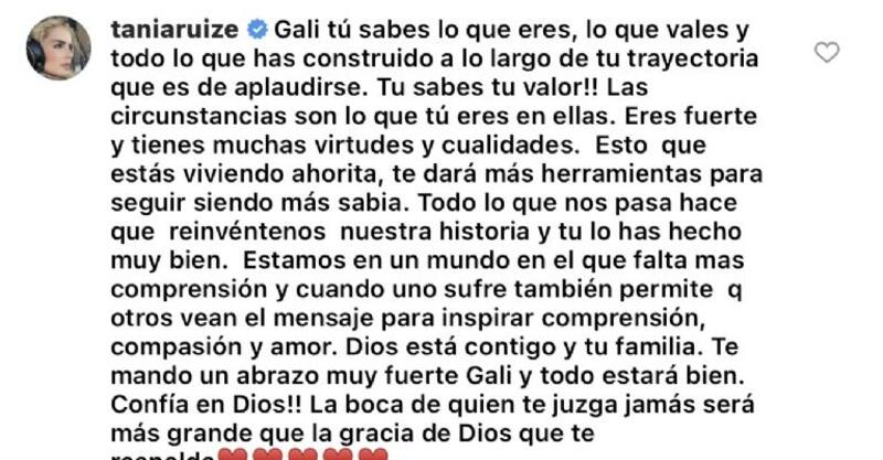 “Gali, tú sabes lo que eres, lo que vales y todo lo que has construido a lo largo de tu trayectoria que es de aplaudirse. ¡Tú sabes tu valor!”, comentó Tania Ruíz, “Estamos en un mundo en el que falta más comprensión, compasión y amor. Dios está contigo y tu familia”, siguió la modelo potosina.