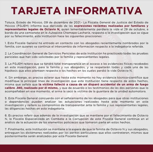 La Fiscalía rompió el silencio a través de un comunicado en Facebook, en donde expusieron su versión oficial de los hechos. “A consecuencia del impacto de la camioneta, accidentalmente Octavio N disparó a sí mismo el arma de fuego que tenía en la mano derecha, la bala le impactó en la cabeza y por esta lesión perdió la vida cuando era trasladado al hospital para recibir atención médica”.