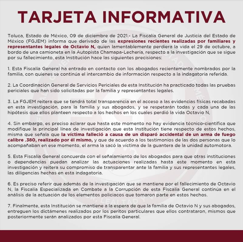"Es preciso aclarar que hasta este momento no hay evidencia técnico-científica que modifique la principal linea de investigación que esta Institución tiene respecto a estos hechos, misma que señala que la víctima falleció a causa de un disparo accidental de un arma de fuego calibre .380, realizado por él mismo", aseguraron.