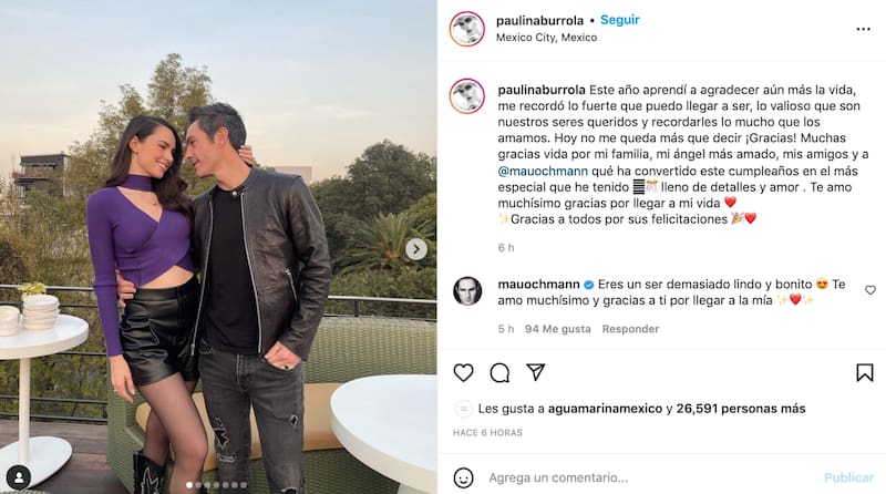 Al respecto, él escribió: "Hoy está de cumple esta belleza de mujer! Tierna, dulce, noble, amorosa, hermosa y divertida que me trae cacheteando las banquetas! Happy birthday amor mío @paulinaburrola".