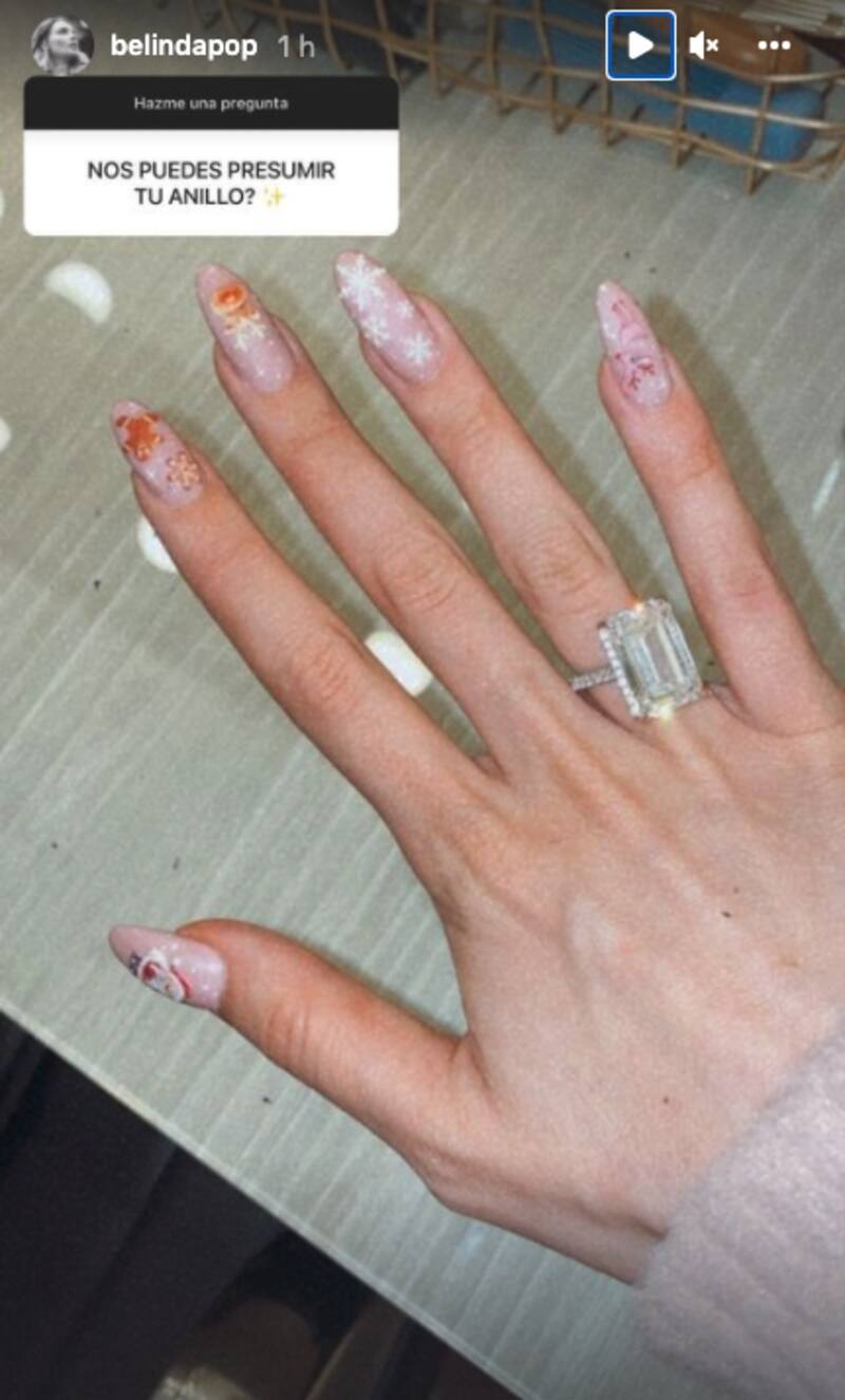 Al tanto, los seguidores de la pareja no han dejado de especular sobre la esperada boda, y en una dinámica de pregunta-respuesta en el Instagram de Belinda, uno de sus fans le pidió presumir su anillo.