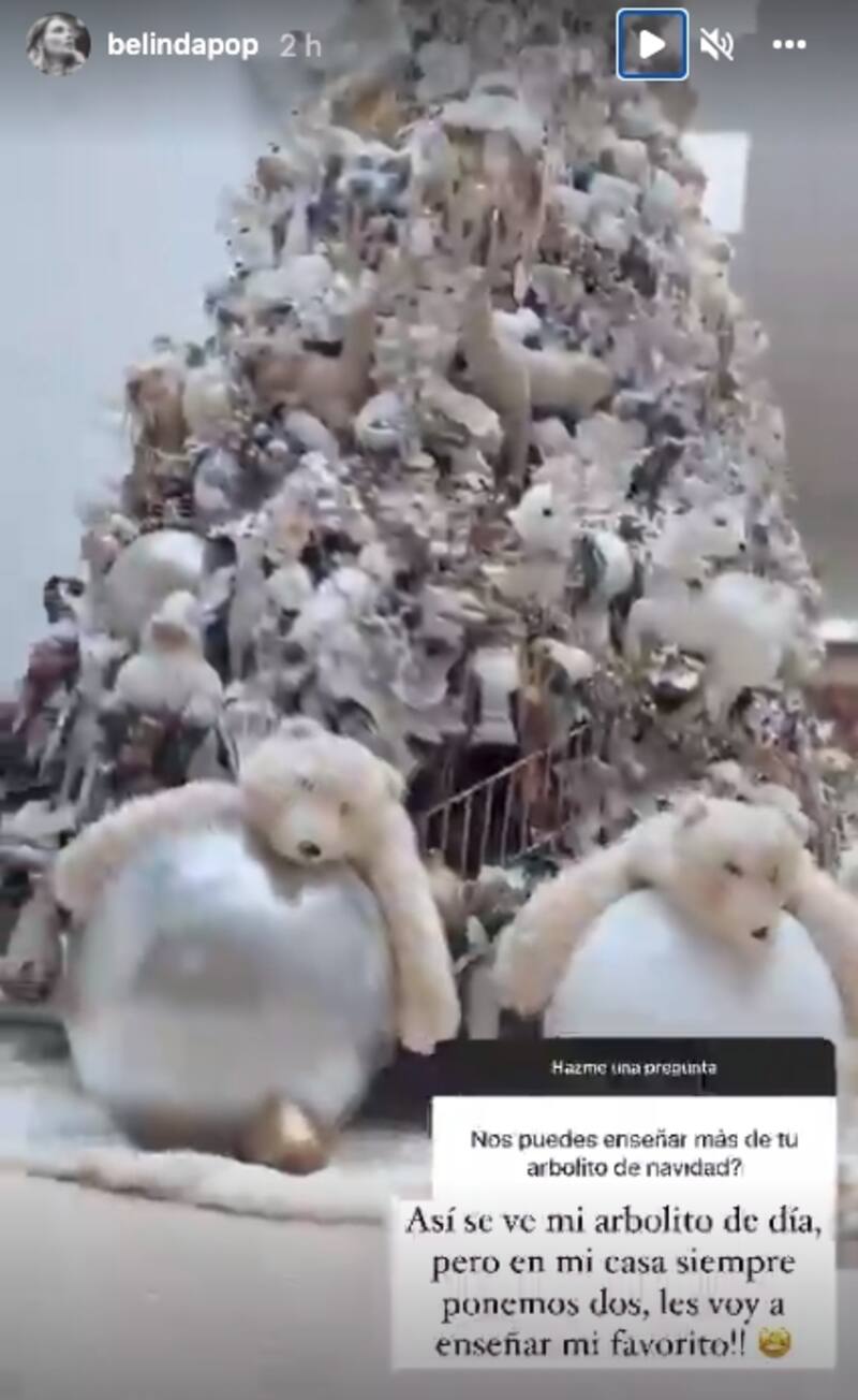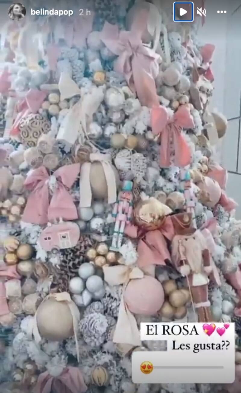 Entre todas las preguntas que sus fans le hicieron a Belinda, también le pidieron volver a mostrar su arbolito de Navidad, a lo que la cantante comentó: "Así se ve mi arbolito de día, pero en mi casa siempre ponemos dos, les voy a enseñar mi favorito!!", mostrando en una segunda historia, su árbol color rosa.