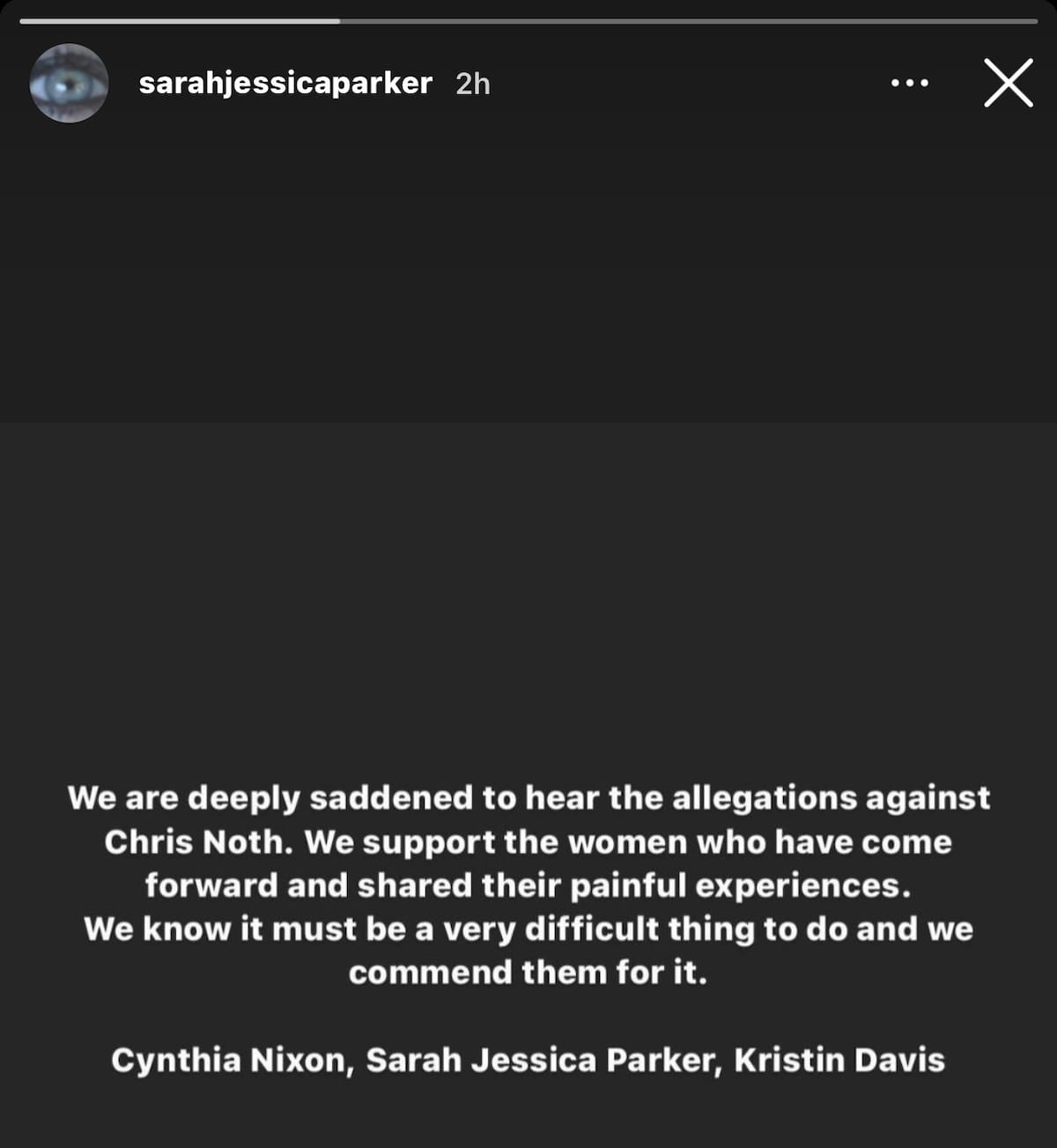 A través de sus redes sociales, Sarah Jessica Parker dio fuertes declaraciones ante sus seguidores, pues compartió una historia en la que escribió su postura ante el caso de Chris Noth.