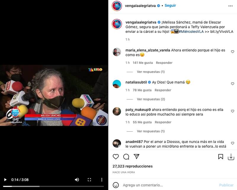 También, la señora Melissa Sánchez puntualizó que Teffy Valenzuela solo quería a su hijo por interés. Las declaraciones de la mamá de Eleazar Gómez provocaron el desacuerdo tanto de los presentadores de "Venga La Alegría", Flor Rubio y Horacio Villalobos, así como de diferentes usuarios.